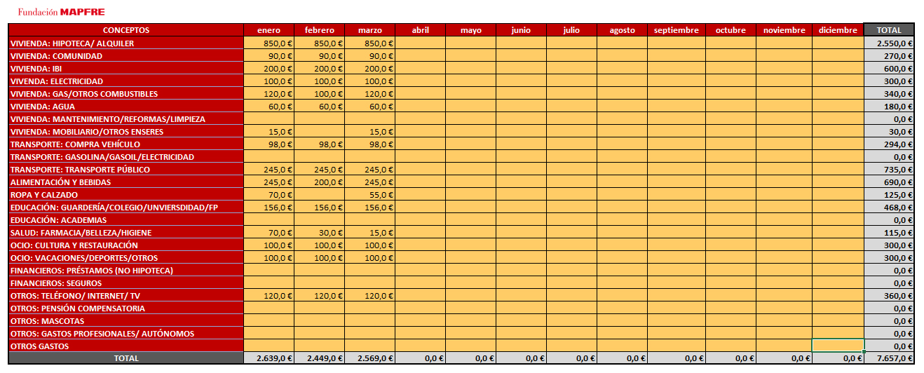 En esta pestaña vamos a hacer el seguimiento de todos los gastos mensuales. Localiza todos los gastos fijos que tienes al año e inclúyelos en la hoja de cálculo (revisa tus tarjetas o tu banco online, ¡que no se te escape ninguno!). También incluiremos los gastos variables habituales como gasolina, la compra en el supermercado, cenas u ocio en general… tú decides hasta qué punto quieres llegar para hacer el mejor desglose posible. En este caso también puedes utilizar la función “SUMA” para el resultado final.
