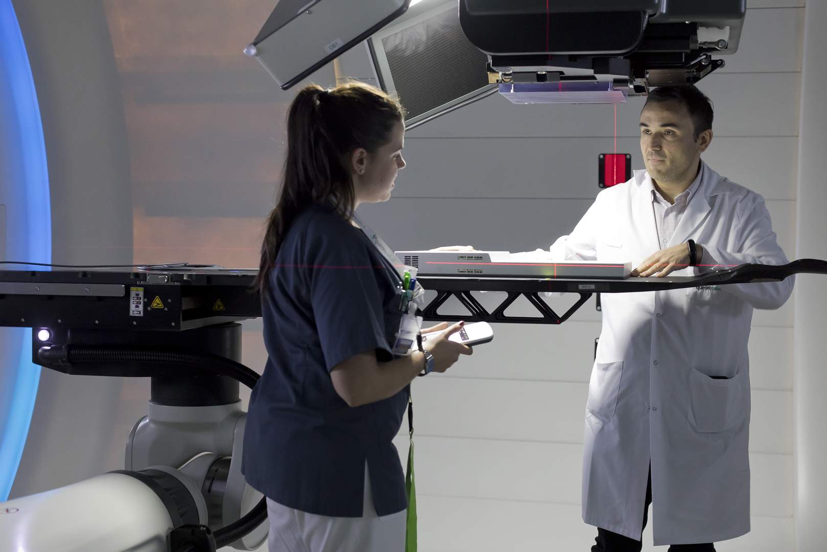 Para administrar correctamente la terapia con protones, el Centro de Protonterapia Quirónsalud cuenta con un equipo multidisciplinar de profesionales formados en centros de referencia de Estados Unidos, Suiza e Italia y que tienen experiencia en la administración de la protonterapia a nivel internacional. La máquina que dispensa la terapia cuenta con un sistema robotizado, que permite que el paciente reciba el haz de protones desde cualquier ángulo, aumentando de esta forma la precisión del tratamiento. Además, incorpora un sistema de escaneado del tumor, facilitando la aplicación de los protones exclusivamente al área afectada.